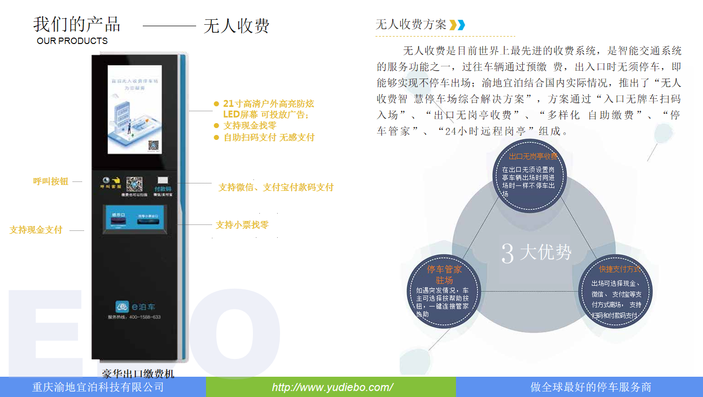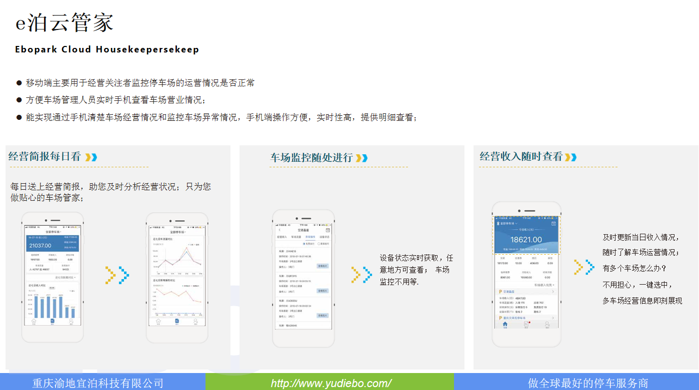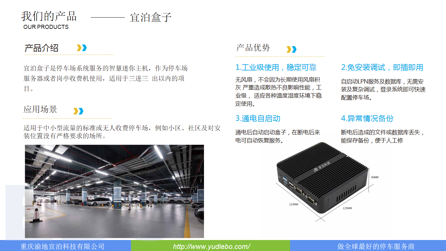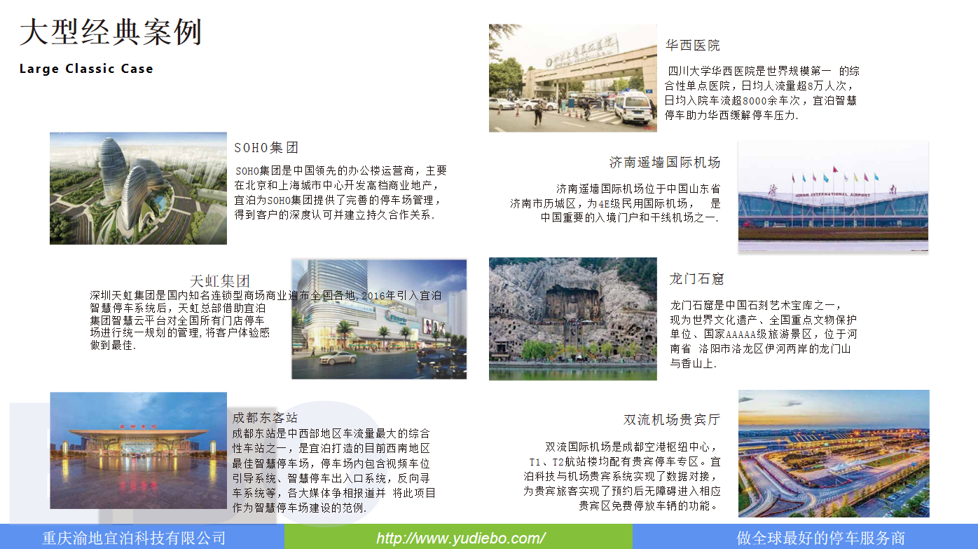 宜泊品牌依托于在停車場行業(yè)內(nèi)超過10年的 經(jīng)驗(yàn),致力于研發(fā)和推廣城市智慧泊車產(chǎn)品,進(jìn)而提升車主的泊車體驗(yàn),優(yōu)化停車場的管理,解決現(xiàn)有城市的泊車難題。目前公司自主研 發(fā)的車牌識(shí)別管理系統(tǒng)已經(jīng)在全國超過1000+個(gè) 項(xiàng)目使用,其中包括成都東客站、仁恒置地、天 虹全國50+商場、世豪廣場、華西醫(yī)院、全國 10+高端SOHO寫字樓、香港西九龍中心等高端 項(xiàng)目.
