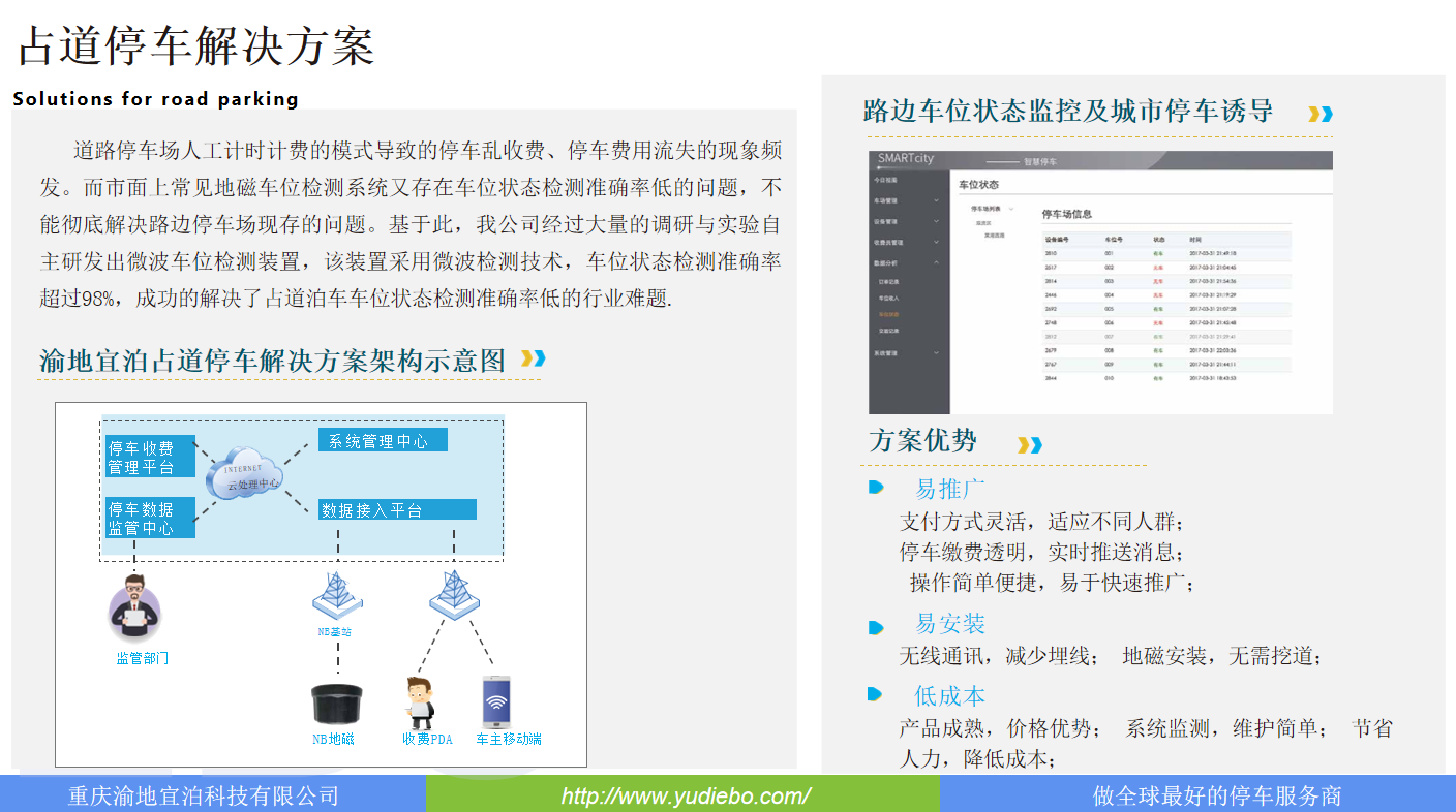 重慶渝地宜泊科技有限公司是經(jīng)重慶市國資委批準(zhǔn),由渝地實(shí)業(yè)公司與成都宜泊信息科技有限公司共同注資成立的集物聯(lián)網(wǎng)、移動(dòng)互聯(lián)網(wǎng)、電子支付于一體的智慧停車解決方案提供商。成立以來,已運(yùn)營管理包括洪崖洞、大世界酒店、康田凱旋國際、民安華府、空港樂園組團(tuán)等近100家停車場。